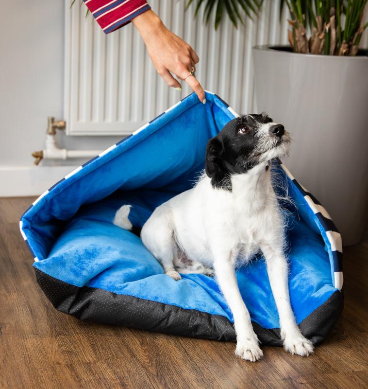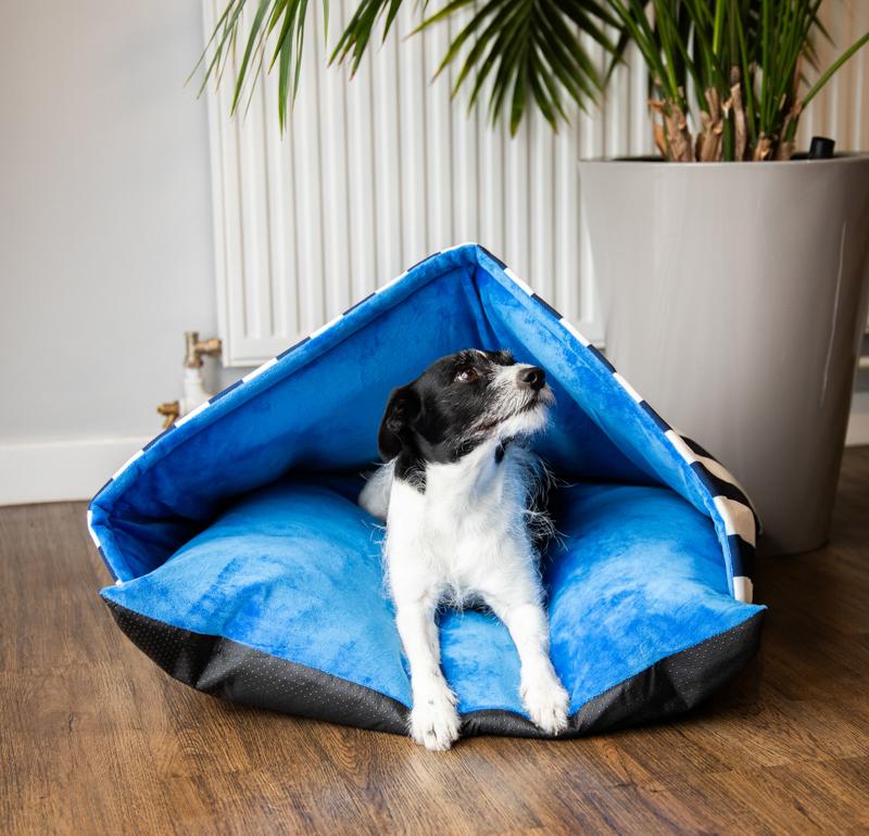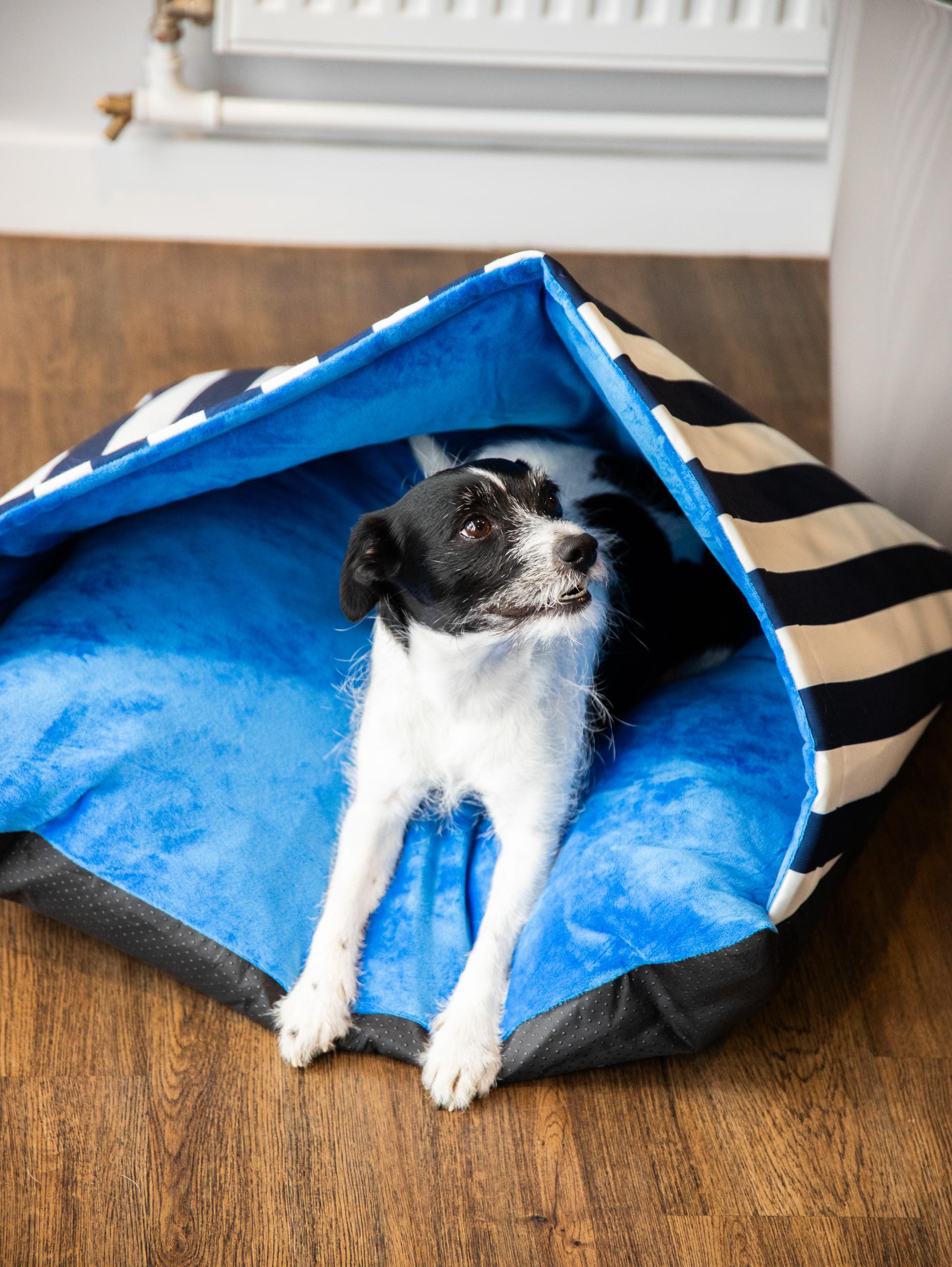 "Eye-catching blue canvas outer with playful dopamine-inspired stripes Soft, plush inner brings a blueberry pop Cosy canopy lets pups dive in and hideout Easy care materials - Durable canvas outer and removable outer cover for easy maintenance" Return to Products