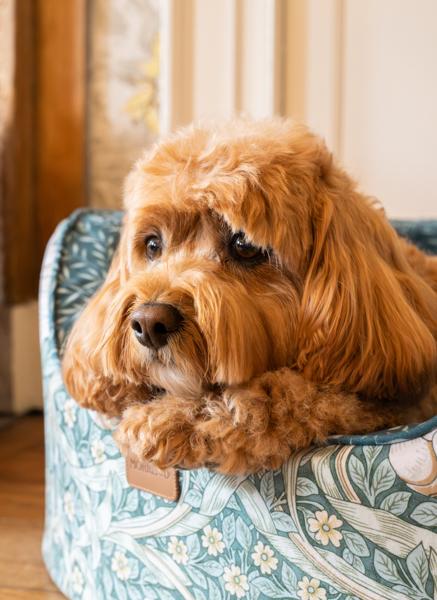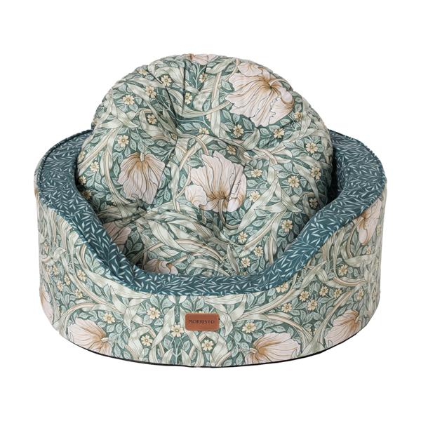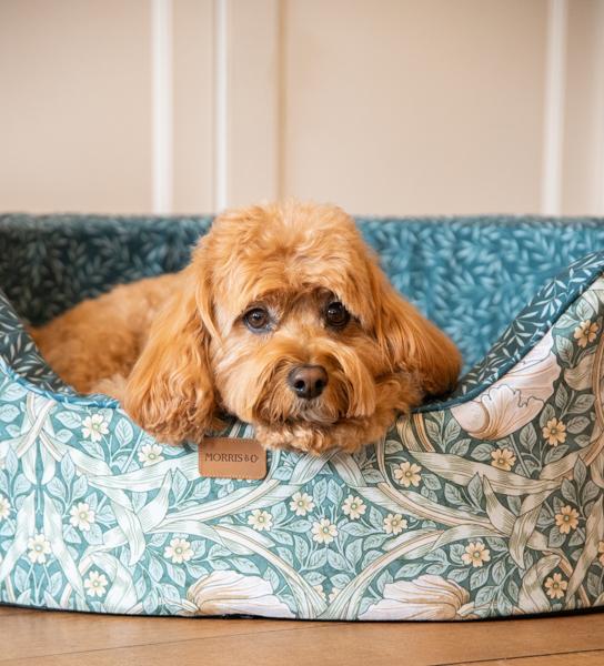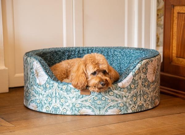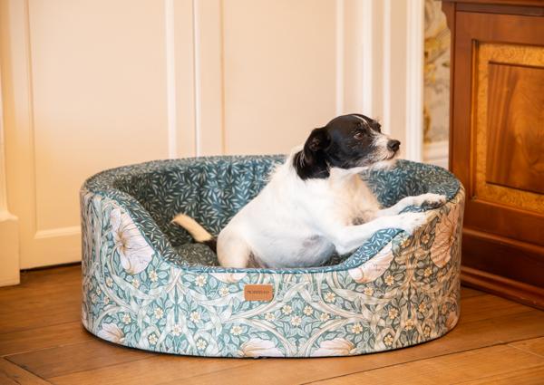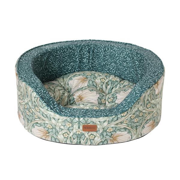 Classic Pimpernel print for timeless elegance Upholstered in high-quality fabric with refined craftsmanship. Unique oval silhouette adds softness and style to any room. Sturdy foam sides provide long-lasting support and create the perfect spot for your dog to rest their head. A standout bed that blends art, heritage, and comfort. Full removable machine washable cover. Available in three sizes.